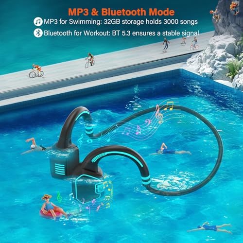 Bone Conduction Headphones: Open Ear design keeps you aware of your surroundings and keeps you safe and comfortable in outdoor training. Bone conduction technology uses vibrations to transmit sound directly to the inner ear through the cheekbones for a premium audio experience.Ultralight & Comfortable: Bone conduction bluetooth headphones are ergonomically designed that fit snugly behind your ears, Ideal for long-term wear avoid ear swelling, that won't slip during long runs workouts or swimming. Made of ultra-light titanium for comfort and the best sports experienceIP68 Waterproof Rating: IP68 rated headphones are fully waterproof, dust-proof, moisture-resistant, making them the perfect workout companion for any sports, fitness, or running enthusiast. Designed to withstand rain and swimming, you can swim, snorkel, fish and boat without taking off the headphones, enjoy the fun of sportsBluetooth/MP3 Dual Mode: Built-in 32 GB mass storage card can be used as an MP3 player, allowing you to enjoy your favorite music directly from the headphones without additional equipment. The latest Bluetooth 5.3 chip brings stronger,faster,more stable connections on the mobile side. Tips: underwater will affect the transmission of Bluetooth signals; please do not use Bluetooth mode when swimming; MP3 mode with our waterproof earbuds will give you the best swimming experienceVersatile Headphones: Powerful Bluetooth 5.3 chip provides a convenient and stable connection. You can use it on both iOS and Android Bluetooth devices. It pairs easily with smartphones, tablets, Mac and PC, and laptops. Quickly double-tap the multi-function key to switch between Bluetooth and MP3 modes,triple-tap to call a voice assistant (such as Siri).2 Year After-sales Service and Online Help: We provide 2 Year after-sales service and online help service, which can help you solve any product problems at any time, please rest assured to order