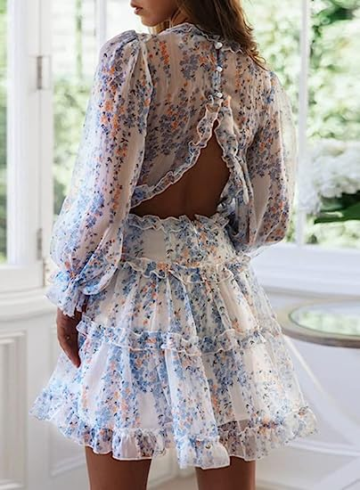 Dokotoo Womens 2023 Spring Summer Deep V Neck Ruffle Long Sleeve Floral Print Mini Dress