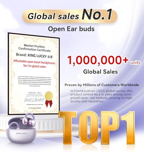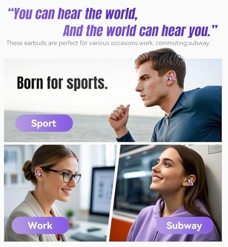 King Lucky Clip on Earbuds Open Ear Wireless Bluetooth 5.4 Headphones with Mic, 50H Play, Noise Cancelling, Waterproof, Comfortable for Small Ears & Glasses Wearers, Sports, Workouts, Purple
