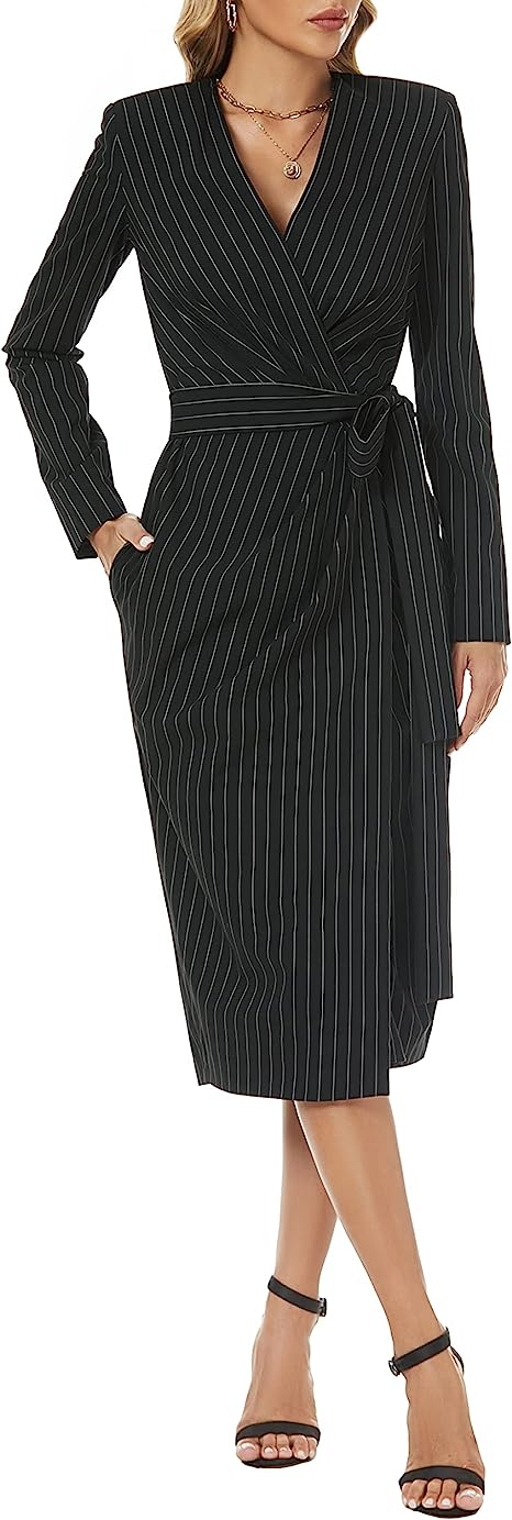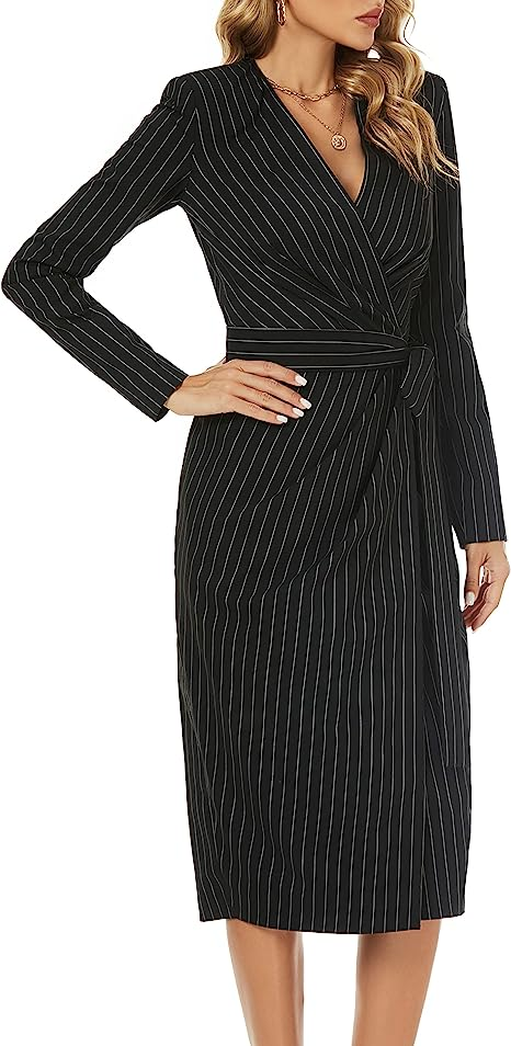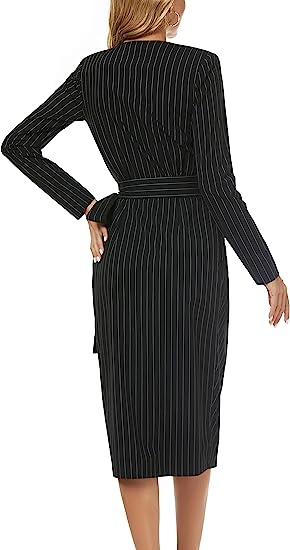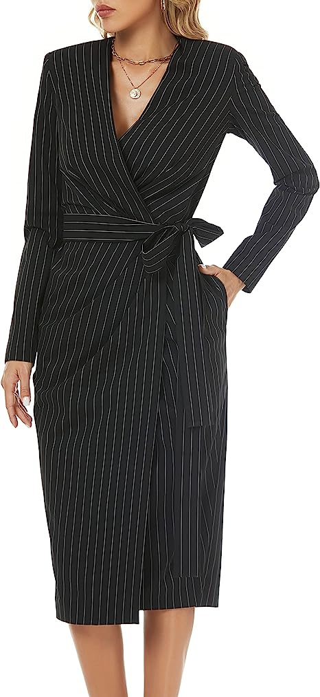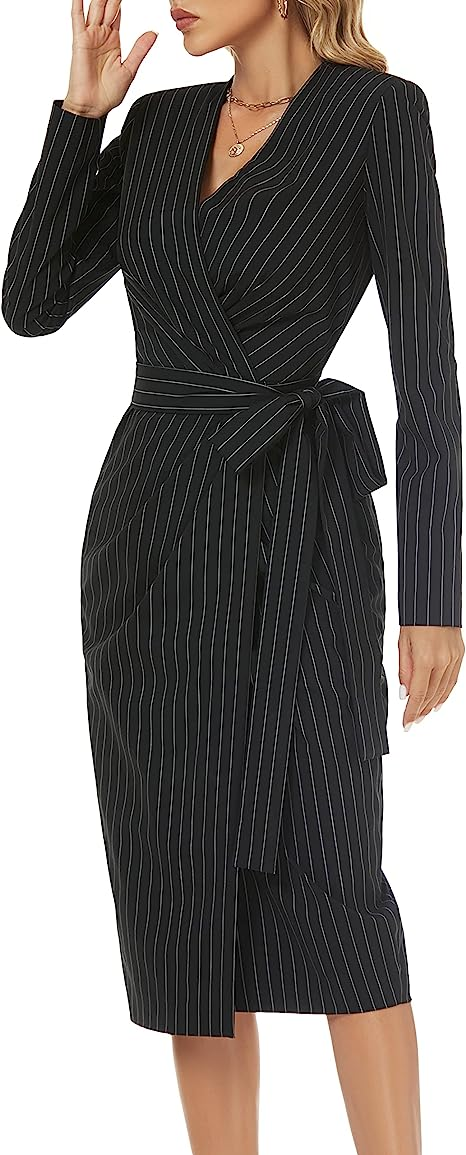 FARAMIUS CLOTHING Women's Striped Black Long Sleeve Wrap V Neck Work Business Office Cocktail Midi Dress