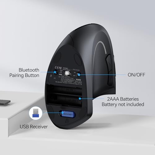 TECKNET Ergonomic Mouse, Wireless Bluetooth Vertical Mouse, 4800 DPI Optical Tracking, 6 Adjustable DPI, Quiet Clicks, 2.4GHz with USB A Receiver, 12 Months Battery, 6 Buttons, Wide Compatibility