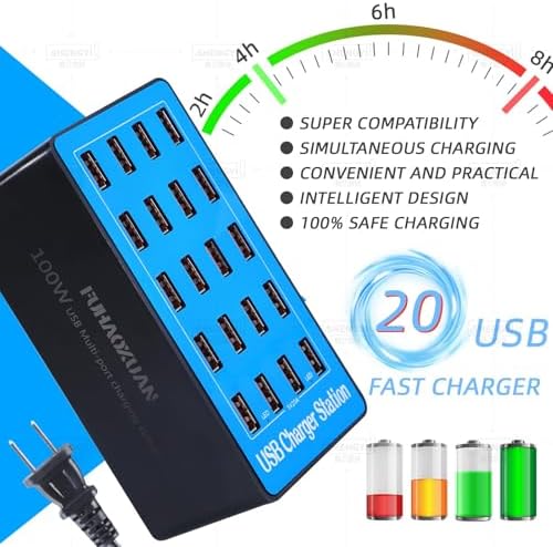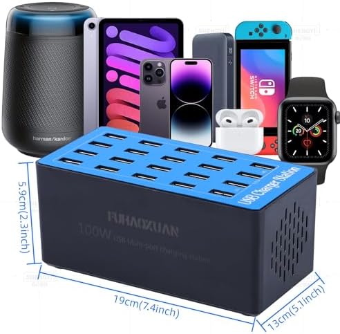 USB Charging Station,100W 20-Port Multi Device Charger with Intelligent Safety Features,Charging Station for Multiple Devices Phone,Watch,Pad,Speakers,Headphones,PS Compact for Home,Office,Travel